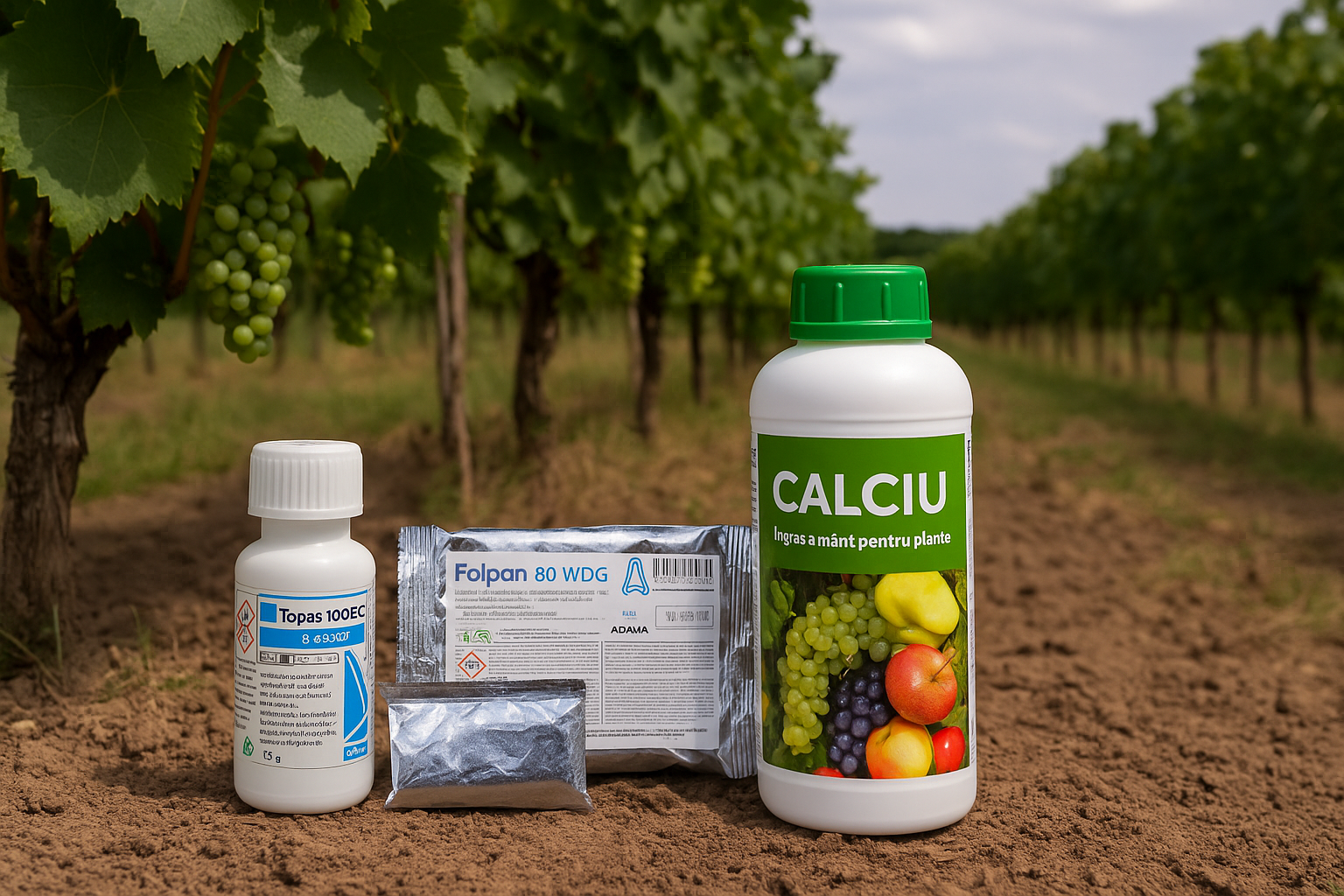 Folpan – fungicid de contact cu acțiune preventivă și curativă împotriva manei (Plasmopara viticola), protejând frunzele și ciorchinii în fazele sensibile de creștere.